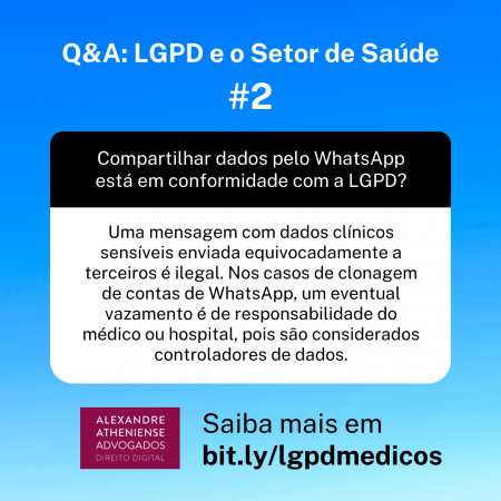 Uma mensagem com dados clínicos sensíveis de um paciente enviada equivocadamente a terceiros, sem prévia autorização ou meios de proteção, é ilegal. Nos casos, por exemplo, de clonagem de contas de WhatsApp, um eventual vazamento também é de responsabilidade do médico ou hospital, pois são considerados controladores de dados, o que resulta na responsabilidade legal por eventuais falhas de segurança e no risco de penalidades.