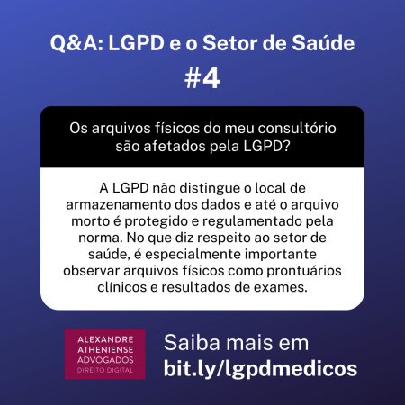 A LGPD não distingue o local de armazenamento dos dados pessoais e até o arquivo morto é protegido e regulamentado pela norma. No que diz respeito ao setor de saúde, é especialmente importante observar arquivos físicos como prontuários clínicos e resultados de exames.